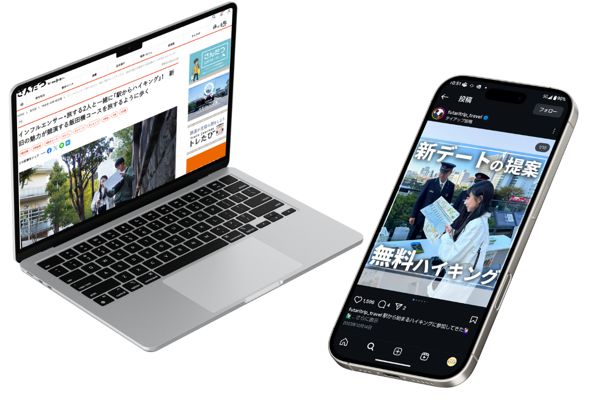 交通新聞社はイベントの企画・制作・運営を得意とし、ターゲットに合わせた様々なメディアでのプロモーションが可能です。 JR東日本様主催「駅からハイキング&ウォーキング」のプロモーションでは、インフルエンサーを活用。20~30代女性へ訴求したいというご依頼から、「旅する2人」さんの起用をご提案し「デート」をキーワードとしてSNSや当社WEBメディアでの紹介で参加を促しました。